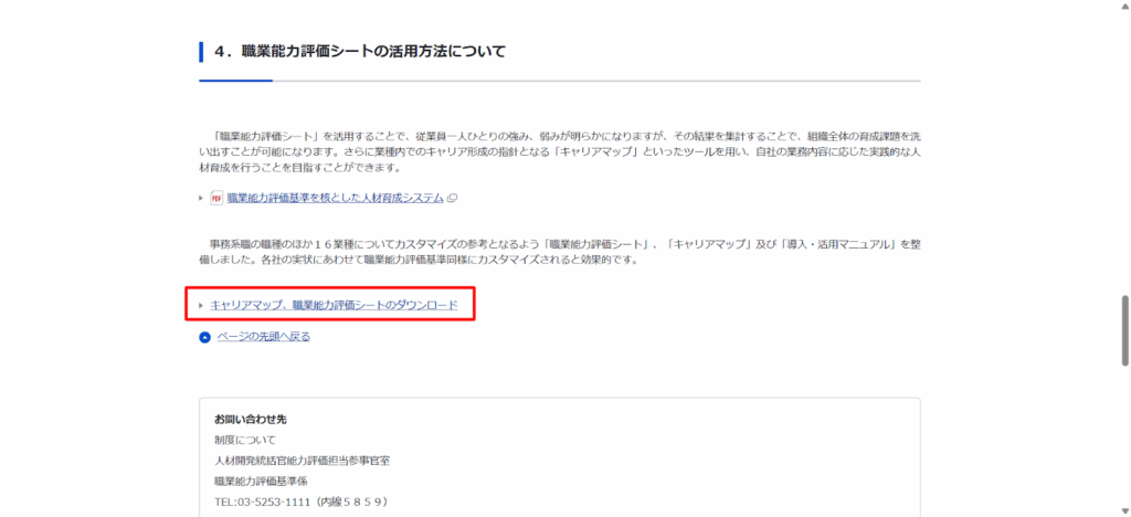 1.厚生労働省の職業能力評価シートのページにアクセスし、キャリアマップ、職業能力評価シートのダウンロードをクリック