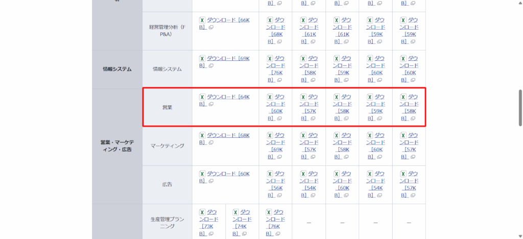 3.「営業・マーケティング・広告」カテゴリーから「営業」を選択し、レベル1(エントリー)からレベル4以降まで、必要なレベルのExcelファイルをダウンロード