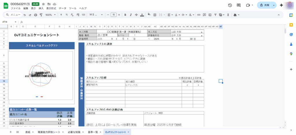 - OJTコミュニケーションシート: 自己評価・上司評価を数値化してグラフ表示するツール