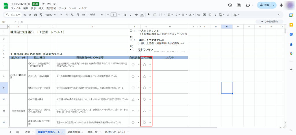 営業担当者は、各スキル項目について自己評価を行います。厚労省の3段階評価(○・△・×)を使用し、具体的な行動事例を思い出しながら、現状を正直に評価することが重要です。
