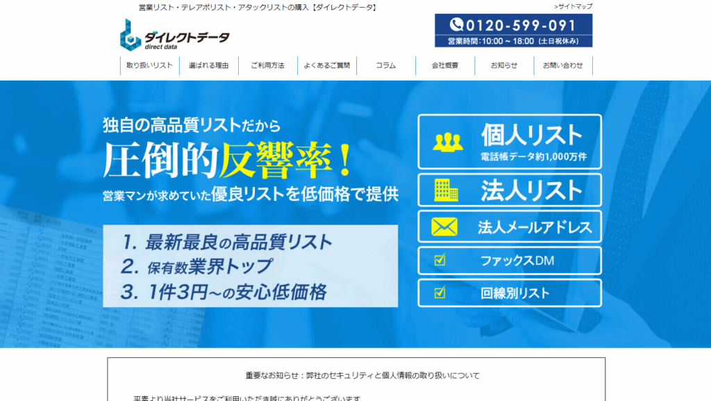 「ダイレクトデータ」は、電話帳データを元にした個人リストや法人リストの購入ができるサービスです。